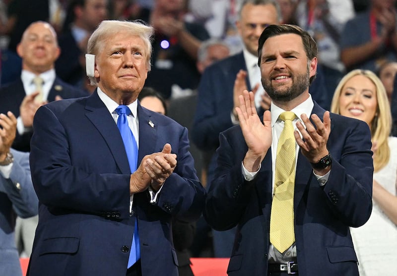 2024年7月16日,在美国威斯康星州密尔沃基市举行的共和党全国代表大会上,共和党总统候选人、前总统特朗普与副总统候选人J.D.万斯(右)鼓掌。(法新社)